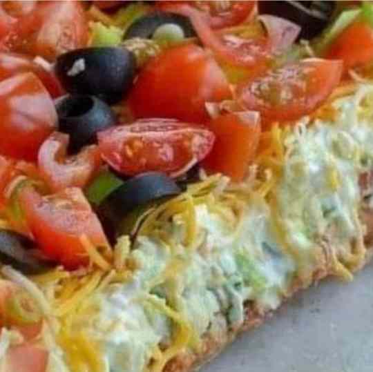 Put the sauce on the layers. Layer tomatoes, green peppers, green onions and lettuce on top of the sauce and cover with cheddar cheese. Garnished with black olives.
