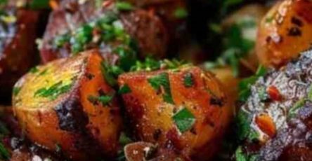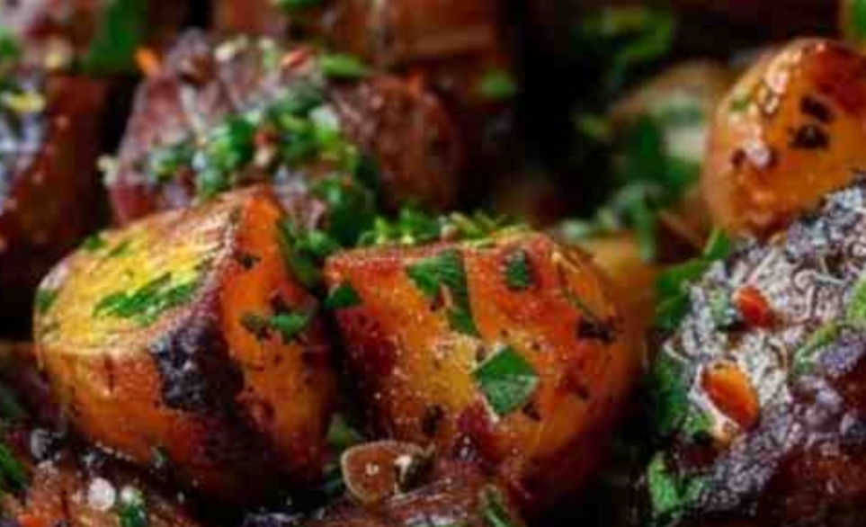 Ingredients:– 1 lb sirloin steak, cut into 1-inch cubes– 1 lb baby potatoes, quartered– 3 tablespoons olive oil, divided– 3 tablespoons butter, melted– 4 cloves garlic, minced– 1 tablespoon fresh parsley, chopped– Salt and pepper to taste– 1 teaspoon garlic powder– 1 teaspoon smoked paprika– Optional: fresh lemon wedges for garnishInstructions:1. **Prepare the Potatoes:**Preheat your air fryer to 400°F (200°C). Toss the quartered potatoes with 1 1/2 tablespoons of olive oil, garlic powder, smoked paprika, salt, and pepper. Place the seasoned potatoes in the air fryer basket and cook for 15 minutes, shaking the basket halfway through for even cooking.2. **Season the Steak:**While the potatoes are cooking, season the steak cubes with salt, pepper, and the remaining olive oil. Set aside.3. **Cook the Steak Bites:**Once the potatoes have cooked for 15 minutes, push them to one side of the air fryer basket. Add the steak bites to the other side and cook everything together for an additional 7-9 minutes, shaking the basket halfway through. Adjust cook time depending on your preferred doneness of the steak.4. **Prepare the Garlic Butter:**While the steak and potatoes are cooking, combine the melted butter, minced garlic, and chopped parsley in a small bowl.5. **Toss and Serve:**Once the steak bites and potatoes are done, remove them from the air fryer and toss with the garlic butter. Serve hot with optional lemon wedges on the side for a burst of freshness.**Prep Time:** 10 minutes | **Cooking Time:** 20 minutes | **Total Time:** 30 minutes**Kcal:** 550 kcal per serving | **Servings:** 4 servingsEnjoy!