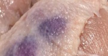 You pull your chicken breasts out of the fridge, ready to start dinner, and then you notice it—dark purple blotches…