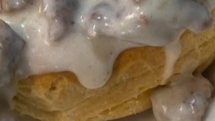 Split warm biscuits and spoon sausage gravy generously over the top.