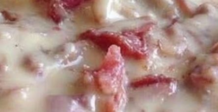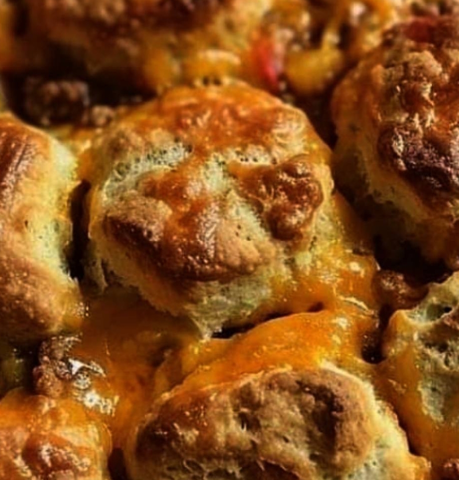To prepare the casserole: Pour the biscuit and meat mixture into the prepared dish and distribute evenly. Spread with cheddar cheese.