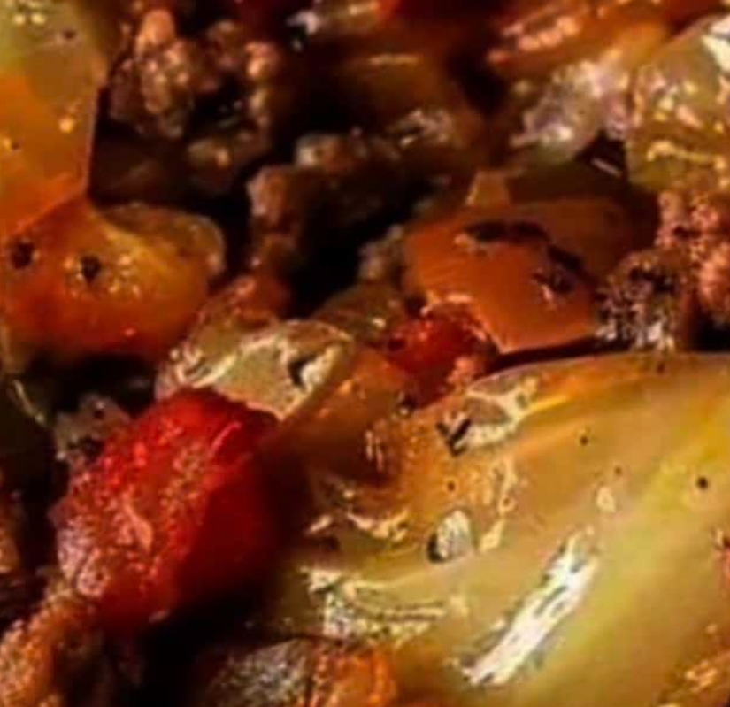 Ingredients:1 little cabbage, cut into small pieces.1 pound of ground beef1 can of chopped tomatoes (15 oz)1 cup of chopped onions2 pieces of garlic, finely chopped1 tablespoon of powdered broth seasoningHalf a teaspoon of cumin1/4 teaspoon of cayenne pepper1/2 teaspoon of smoked paprikaAdd salt according to your preference.PREPARATION:Prepare the minced meat.Put the minced meat in a big pan or a large cast-iron skillet on medium heat.Use a wooden spoon to separate the ground beef while cooking until it turns brown.Cook onions and garlic in a pan with a little oil.Put the minced meat on one side of the pan and add the chopped onions and garlic to the other side.Cook the onions and garlic until they smell good and look clear, for about 2-3 minutes.Include tomatoes and spices.Add the chopped tomatoes and their liquid.Put in the broth powder, cumin, spicy pepper, smoked paprika, and salt.Mix everything together and heat the mixture until it boils.Cook the mixture over low heat.Lower the heat to medium-high and let it cook for around 5 minutes so the flavors can mix together.Try the mixture and add more salt or other seasonings if necessary.Include cabbage.Put the sliced cabbage in the pan and mix it with the beef and tomato mixture.Keep cooking, stirring from time to time, until the cabbage is soft, for approximately 10-15 minutes.Help:Serve the dish hot and savor its delicious and strong flavors.Have fun!Enjoy !