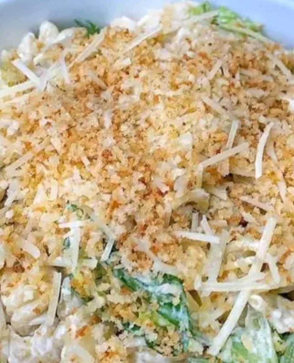 - Add croutons and grated Parmesan cheese. Toss gently to combine.