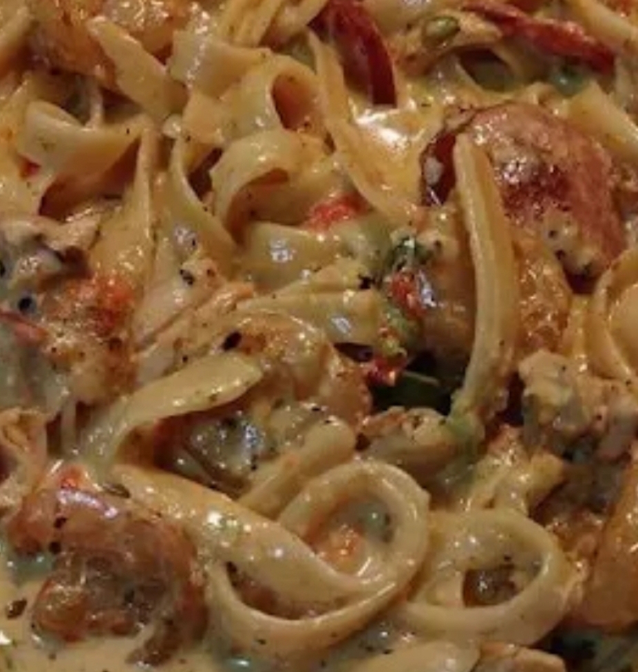 • Return the cooked pasta, shrimp, and sausage to the pot. Toss everything together in the creamy Cajun sauce until fully coated. Let the mixture simmer for an additional 2–3 minutes to meld flavors.