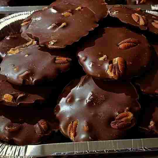 While the caramel is hardening, heat the semi-sweet chocolate chips in a bowl that can be used in the microwave. Heat the chocolate in the microwave for 30 seconds at a time, stirring in between, until it is completely melted and smooth. Use a spoon or a pastry bag to pour or place the melted chocolate on top of each cluster of caramel and pecans, making sure the caramel is completely covered. Allow the candies with chocolate on top to sit at room temperature or put them in the fridge until the chocolate becomes completely hard.