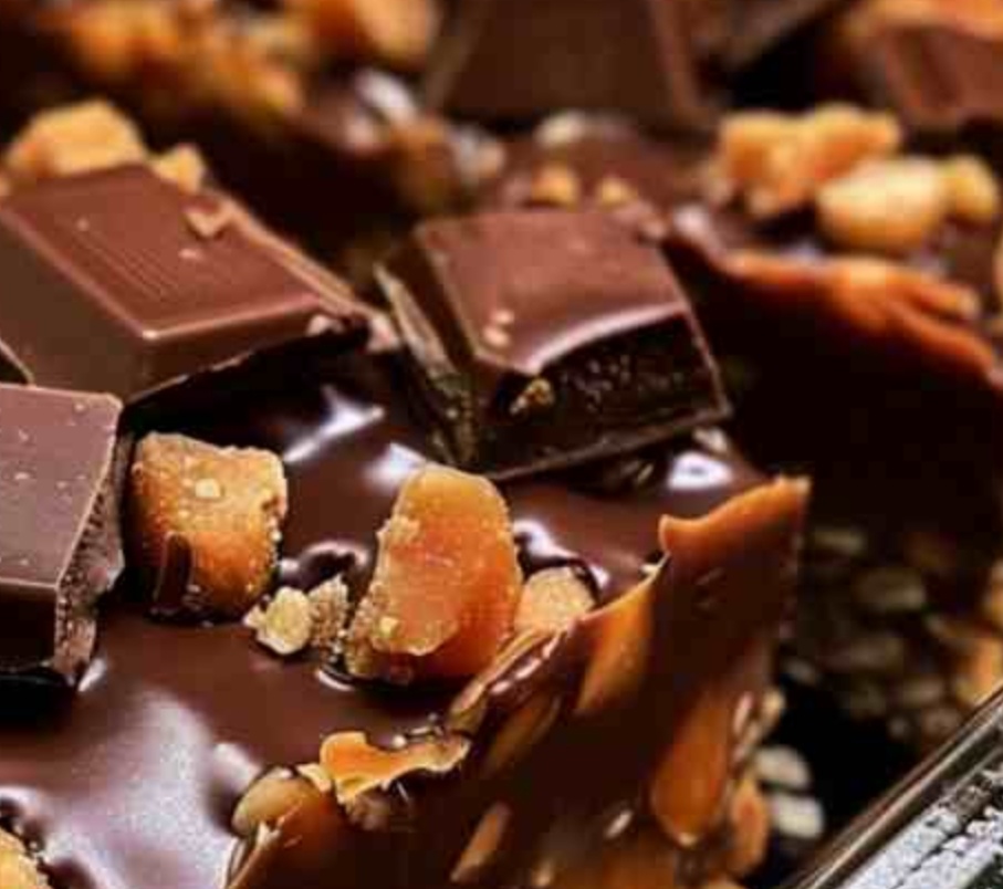 Once the chocolate is melted, pour it evenly over the caramel crunch layer in the pan. Use a spatula to spread the chocolate into an even layer. Be gentle, as you don’t want to disturb the caramel crunch layer underneath.