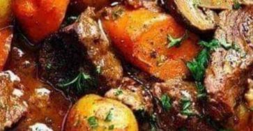 Slow Cooker Beef Bourguignon has crazy tender melt in your mouth beef and hearty veggies slow cooked to perfection in…