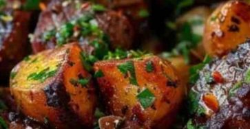 Ingredients:– 1 lb sirloin steak, cut into 1-inch cubes– 1 lb baby potatoes, quartered– 3 tablespoons olive oil, divided– 3…