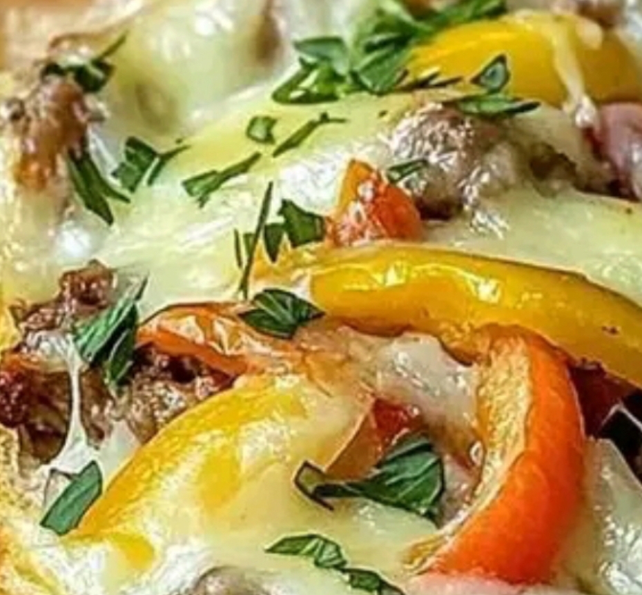 Cheesesteak-Stuffed Garlic Bread is a baked dish featuring a hollowed bread loaf filled with chopped steak, melted cheese, and sautéed vegetables. The stuffed bread is topped with garlic butter and baked until crispy.