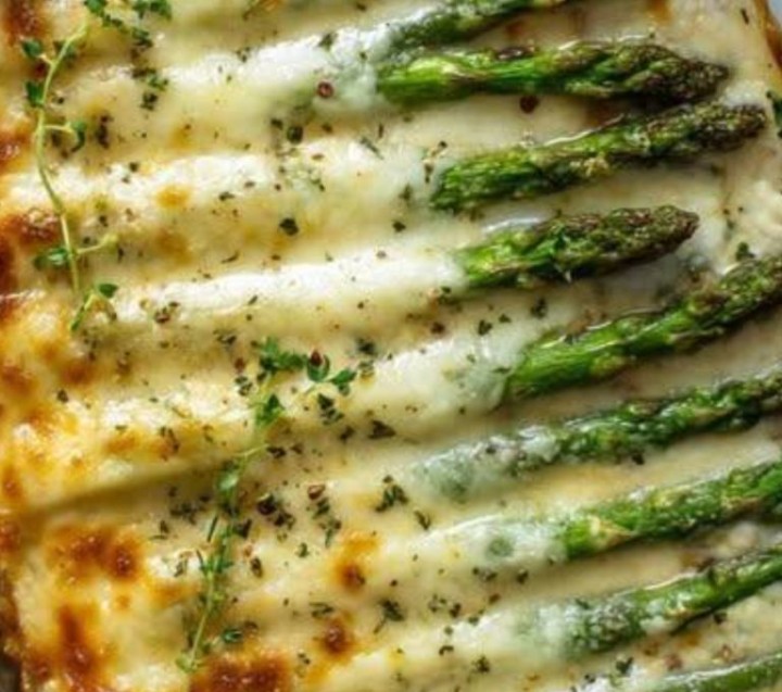 Heat the oven to 400 degrees. – Wash and trim the asparagus, then grease a 9 x 13 baking tray and place them in it. In a skillet, melt the butter over medium heat, then add the soft cheese, heavy whipping cream, chicken broth, garlic powder, paprika, Italian seasoning, salt, and pepper. Stirring constantly until ingredients are well blended.