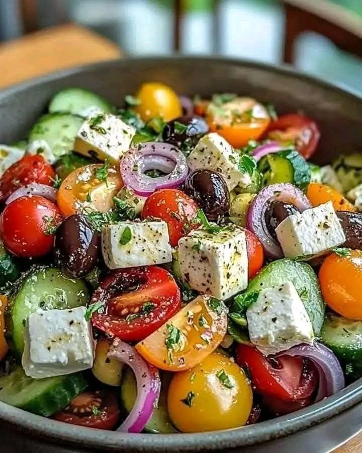 A vibrant, refreshing salad loaded with juicy tomatoes, crisp cucumbers, red onion, tangy olives, and creamy feta cheese. Perfect as a light main dish or a side for Mediterranean meals.