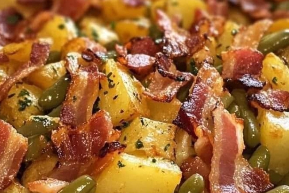 IngredientsIngredient QuantityGreen beans, trimmed 1 poundBaby potatoes, halved or quartered 1.5 poundsBacon, cooked and crumbled 6 slicesRanch seasoning mix 1 packetButter, melted 3 tablespoonsGarlic, minced 2 clovesSalt and pepper To tasteFresh parsley, chopped (for garnish)Instructions:Cook the Potatoes: Boil baby potatoes in salted water for 10-12 minutes, or until tender. Drain and set aside.Cook the Green Beans: Boil green beans in the same pot for 5-7 minutes, or until tender-crisp. Drain and set aside.Cook the Bacon: Fry bacon until crispy, crumble, and reserve 1 tablespoon of bacon grease.Make the Ranch Butter: Whisk together melted butter, ranch seasoning, and minced garlic in a small bowl.Combine Everything: In the skillet with reserved bacon grease, toss cooked potatoes, green beans, and crumbled bacon. Pour ranch butter mixture over and toss to coat.Serve: Season with salt and pepper, garnish with parsley, and serve warm.