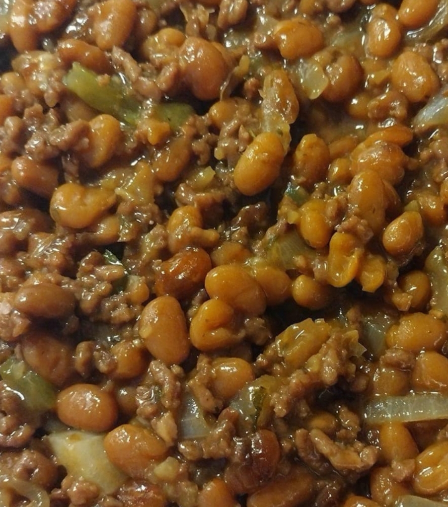 Combine Ingredients: In a large baking dish, mix the cooked beef with the baked beans. Stir in the chopped onions and green bell peppers, distributing them evenly.