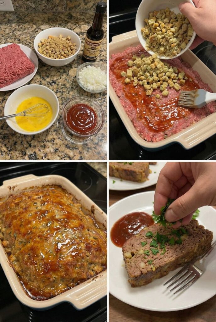 Combine ketchup, brown sugar and mustard to make topping. Spoon half of the topping over the meatloaf after 30 mins of baking. Return loaf to oven for 10 more mins of baking. Spoon the rest of the topping over meatloaf, return to oven and bake for 5-10 mins more.