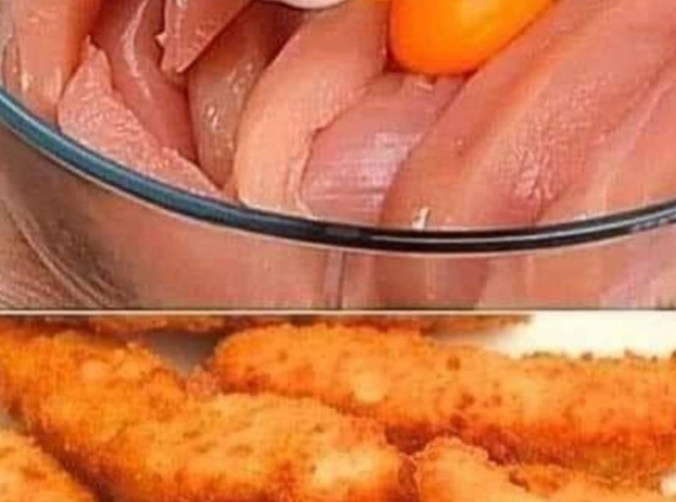 Ingredients:3 eggs2 chicken fillets2 cloves of garlic2 tablespoons of spices2 tablespoons of corn starchOilSalad1 tablespoon of saltInstructions:The egg yolk from the egg white.Cut the chicken into strips. Mix with egg yolk, garlic, spices, salt and starch.Beat the egg whites in a bowl. Pour the oil into the pan.Dip the chicken in the egg whites.Grill. Decorate with lettuce and cherry tomatoesEnjoy!