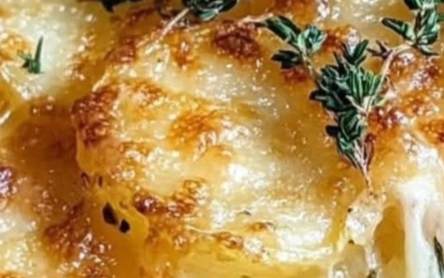Crispy Parmesan and Gruyere Potato Gratin is the ultimate comfort food, combining thinly sliced potatoes with rich, creamy layers of Gruyere and Parmesan cheese. Baked to golden perfection, this dish features a crispy top and velvety interior that’s irresistible. Perfect for holiday feasts or weeknight dinners, it pairs beautifully with roasted meats or vegetables. The addition of garlic and nutmeg elevates its flavor profile, making it a standout side dish. Easy to prepare yet indulgent, it’s a recipe you’ll turn to again and again!Ingredients:4 large potatoes (about 2 pounds)1 cup grated Gruyere cheese1 cup grated Parmesan cheese2 cups heavy cream2 cloves garlic, minced1/4 teaspoon nutmegSalt and pepper to taste2 tablespoons butter (for greasing the dish)Fresh parsley (for garnish, optional)Instructions:1. Preheat Oven: Set your oven to 375°F (190°C). Grease a baking dish with butter for a non-stick base.2. Prepare the Potatoes: Peel and thinly slice the potatoes (about 1/8 inch thick). Use a mandoline for perfectly even slices.3. Make the Cream Mixture: In a mixing bowl, combine heavy cream, minced garlic, nutmeg, salt, and pepper. Stir until well blended.4. Layer the Dish:Spread half the potato slices in the greased baking dish.Pour half the cream mixture evenly over the potatoes.Sprinkle half the Gruyere and Parmesan cheeses on top.Repeat with the remaining potatoes, cream, and cheeses.5. Bake: Cover the dish with aluminum foil and bake for 45 minutes. Remove the foil and bake for an additional 30-40 minutes until the top turns golden and crispy.6. Cool and Serve: Allow the gratin to cool for about 10 minutes before serving. Garnish with fresh parsley for a pop of color and flavor (optional).CrispyPotatoGratin, ParmesanGratin, GruyereCheese, CheesyPotatoes, PotatoSideDish, ComfortFood, EasyRecipes, HolidayRecipes, PotatoLovers, GoldenCrispyTopPro Tip: Serve this Crispy Parmesan and Gruyere Potato Gratin as a side for roasted chicken, steak, or a festive holiday meal! It’s the ultimate comfort food your family will love.Enjoy!