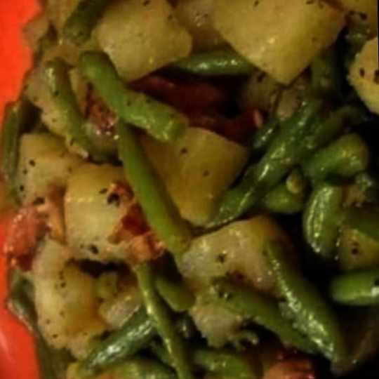 - Mix, then add the bacon bits. Leave to brown for a few moments before adding the flat beans and sprinkle with chopped parsley.