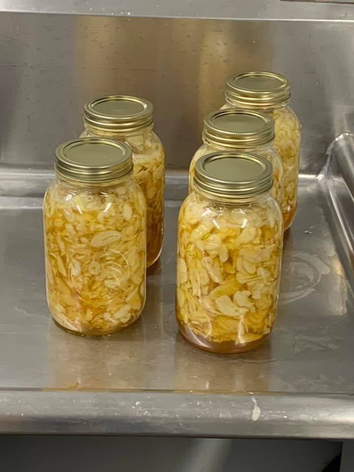 Combine chopped fresh garlic, chopped fresh onion, grated fresh ginger root, grated fresh horseradish, and chopped or sliced fresh cayenne pepper.