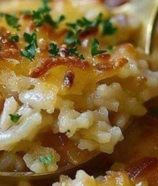 Layering Flavors: Pour the beef broth over the rice, ensuring it’s evenly distributed. Follow this by pouring in the French onion soup, infusing the rice with its savory essence.