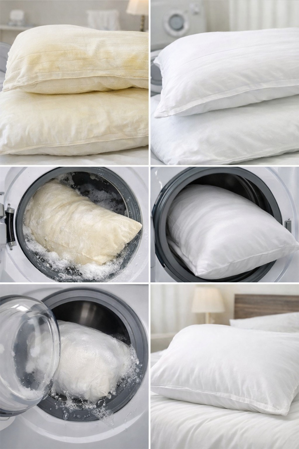 To wash your pillows and get them white like new using this method, first make sure you can wash them in the washing machine by referring to your product label. Then just pour detergent into the detergent drawer then add ½ cup of baking soda and a few drops of lavender essential oil directly to the drum. Place two pillows in the washing machine and run a wash cycle.