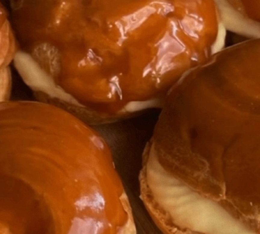 3. Filling preparation: Fill the pinwheels with caramel pudding and decorate with whipped cream.