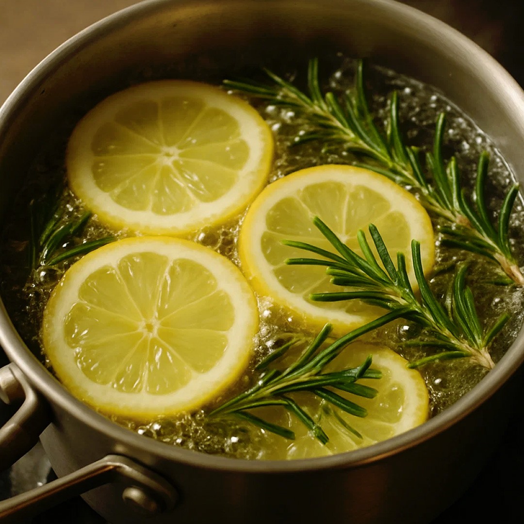 Want to try it? It couldn’t be simpler. Just cut a lemon into thick slices and place them in  a saucepan  filled with water. Add a sprig of  fresh rosemary  ( or dried if that’s all you have ), bring to a boil, then reduce the heat and simmer gently. Within minutes, the magic happens: the aromas of lemon and rosemary rise, fill the kitchen, and even waft into other rooms.