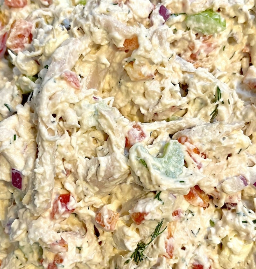 Combine Chicken and Vegetables: In a large bowl, add the shredded cooked chicken, diced red onion, diced red pepper, and diced celery stalks. Toss the ingredients together to ensure they are evenly mixed.