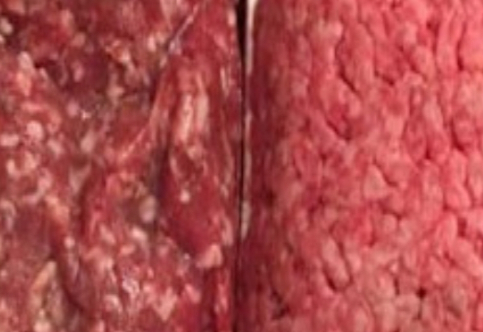 The darker color of the beef on the left suggests it hasn’t been exposed to as much oxygen or preservatives, and it may have a higher fat content, often indicating fresher, less processed meat. The beef on the right, though brighter in color, is not necessarily fresher. In fact, that bright pink hue is often due to carbon monoxide packaging or other gas treatments used to keep the meat looking fresh longer. And if you look closely at the bottom of the right package, there’s a grayish-brown spot—likely a sign of oxidation, which happens when meat is aging or hasn’t been stored properly.