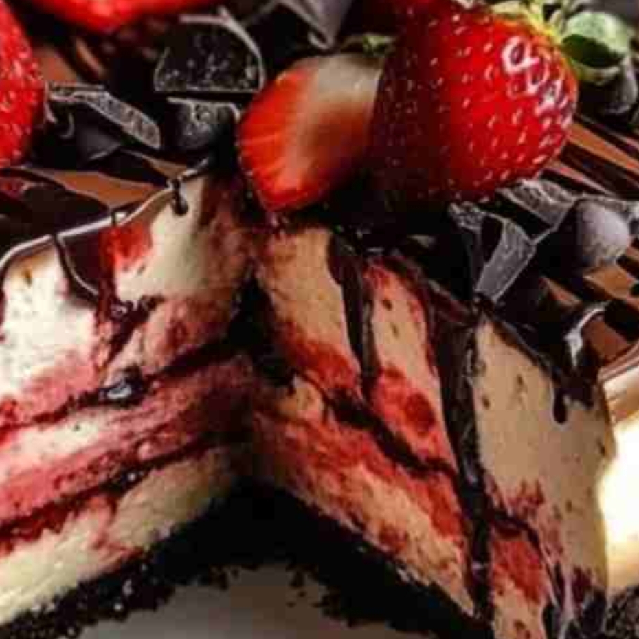 Ingredients– **For the Crust:**– 2 cups chocolate cookie crumbs (e.g., Oreo crumbs)– 1/4 cup melted butter– **For the Cheesecake Layers:**– 3 (8 oz) packages of cream cheese, softened– 1 cup granulated sugar– 3 large eggs– 1 teaspoon vanilla extract– 1/2 cup sour cream– 1/2 cup heavy cream– 1/4 cup strawberry puree (made from fresh or frozen strawberries)– 1/4 cup chocolate ganache (optional, for an extra layer)– **For the Strawberry Layer:**– 1 cup fresh strawberries, sliced– 1/4 cup strawberry jam– **For the Topping:**– Fresh strawberries, halved– 1/2 cup chocolate ganache, for drizzling– Chocolate shavings or chipsPreparation1. **Prepare the Crust:**– Preheat your oven to 325°F (163°C).– In a medium bowl, mix the chocolate cookie crumbs with the melted butter until combined.– Press the mixture into the bottom of a 9-inch springform pan to form an even layer.– Bake the crust for 10 minutes, then set aside to cool.2. **Make the Cheesecake Layers:**– In a large mixing bowl, beat the softened cream cheese until smooth.– Add the granulated sugar and continue to beat until fully combined.– Add the eggs one at a time, mixing well after each addition.– Mix in the vanilla extract, sour cream, and heavy cream until smooth.– Divide the batter into two equal portions. In one portion, gently fold in the strawberry puree to create the strawberry cheesecake layer.– Pour the plain cheesecake batter over the baked crust, spreading it evenly.– Gently pour the strawberry cheesecake batter over the plain layer.– Optional: If adding a chocolate layer, drizzle the chocolate ganache over the strawberry layer and lightly swirl it with a knife.3. **Bake the Cheesecake:**– Place the cheesecake in the oven and bake for 50-60 minutes, or until the center is almost set.– Turn off the oven and crack the door open slightly, allowing the cheesecake to cool slowly in the oven for an hour.– Once cooled, refrigerate the cheesecake for at least 4 hours or overnight to set completely.4. **Assemble the Strawberry Layer:**– Once the cheesecake is set, spread the strawberry jam over the top of the cheesecake.– Arrange the sliced fresh strawberries on top of the jam.5. **Add the Toppings:**– Drizzle the top of the cheesecake with chocolate ganache.– Garnish with fresh strawberry halves and chocolate shavings or chips.6. **Serve:**– Carefully remove the cheesecake from the springform pan.– Slice and serve chilled.This layered strawberry chocolate cheesecake is perfect for special occasions or as a show-stopping dessert for any gathering!If you need any other variations or more specific details, feel free to ask!Enjoy!