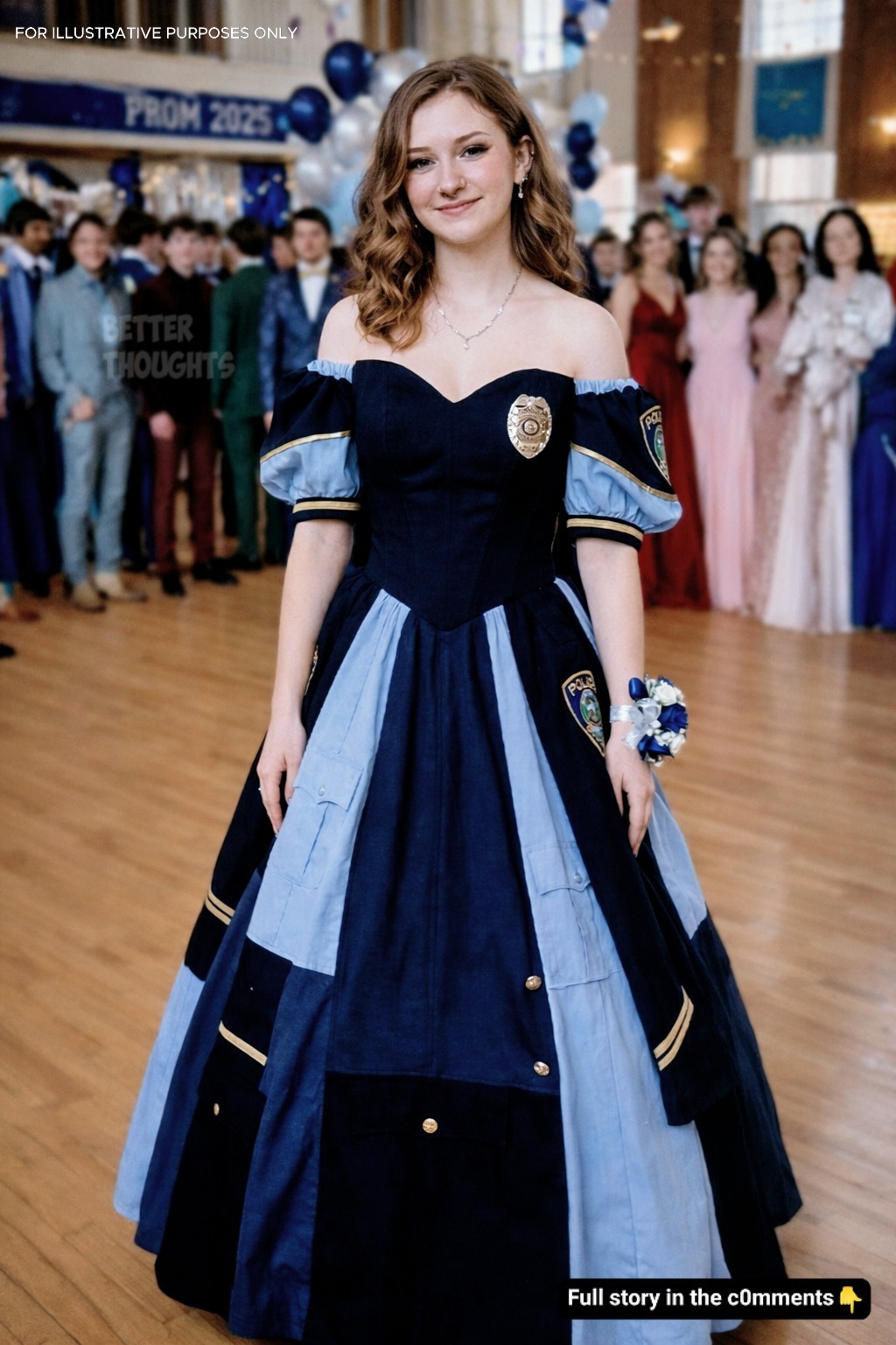 My daughter sewed her prom dress from her late father’s police uniform. When a mean classmate poured punch on it, the girl’s mother took the microphone and said one sentence that froze the entire gym.I’m 45, and my daughter Wren is 17.She lost her dad when she was just four. He was a police officer—the kind of man who made pancakes at midnight and called her “his brave girl.”Prom was never really her thing. “I don’t need it,” she told me. “It’s all fake anyway.”But one night, I found her standing quietly in front of his old uniform, her fingers gently tracing the fabric. She whispered, almost as if she were speaking directly to him, “What if he could still take me?”From that moment on, she spent two months working on that dress. Every stitch, every tear—she did it all by herself. When it was finally finished, she carefully pinned his silver badge over her heart.On the night of prom, she looked beautiful— not flashy, but real. And people noticed.Unfortunately, that’s exactly what Chloe couldn’t stand. Chloe was rich, loud, and always desperate to be the center of attention. She walked over slowly, looked Wren up and down, then let out a sharp laugh. “Wow… this is actually pathetic,” she said loudly. “You really built your whole personality around a dead cop?”The entire room fell silent. Wren froze. Chloe leaned in closer, her voice cutting deeper: “You know what’s even worse? He’s probably up there right now, watching you… and he’s embarrassed.”My heart stopped. Wren’s hands began to tremble. Then Chloe smiled, lifted her cup, and said, “Let’s fix this.” She poured the punch straight onto Wren’s chest. The red liquid spread across the navy fabric, slowly dripping over the badge.Silence filled the room. Phones came out. My daughter just stood there, frantically trying to wipe her father’s badge clean.Then a sharp screech cut through the speakers. Chloe’s mother had taken the mic. Her hands were shaking as she looked straight at her daughter and said, “Do you even know who that policeman is to you? He wouldn’t be ashamed of her.”There was a pause, and her voice broke. “He would be ashamed of you. And here’s why…”𝗙𝗨𝗟𝗟 𝗦𝗧𝗢𝗥𝗬 𝗶𝗻 𝘁𝗵𝗲 𝗳𝗶𝗿𝘀𝘁 𝗖𝟬𝗠𝗠𝗘𝗡𝗧