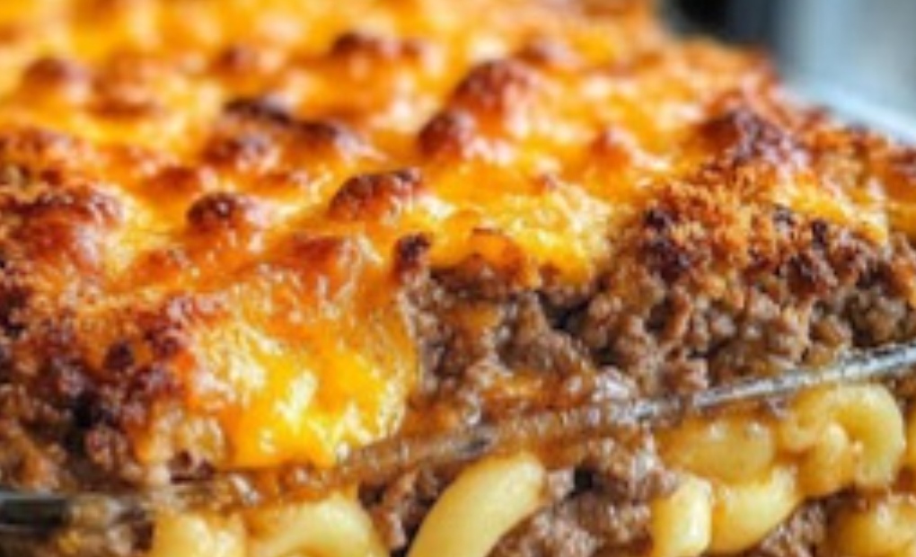Spread the prepared macaroni and cheese over the meatloaf layer. Sprinkle shredded cheddar cheese on top.