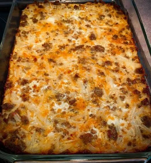 It combines savory breakfast sausage, crispy hashbrowns, melty cheddar cheese, and fluffy baked eggs into one satisfying dish. Everything comes together in a single casserole, making it perfect for meal prep, family breakfasts, or feeding a crowd without stress.