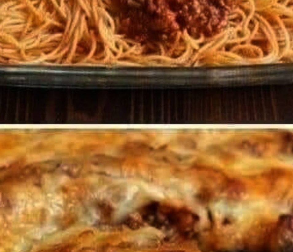 Pour the meat and sauce mixture over the noodles.