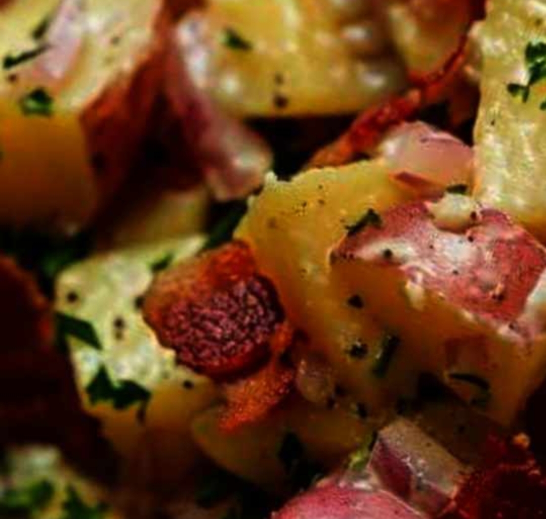 4. Pour the mixture over the potatoes, onions, and bacon. Give it a gentle stir to coat everything evenly.