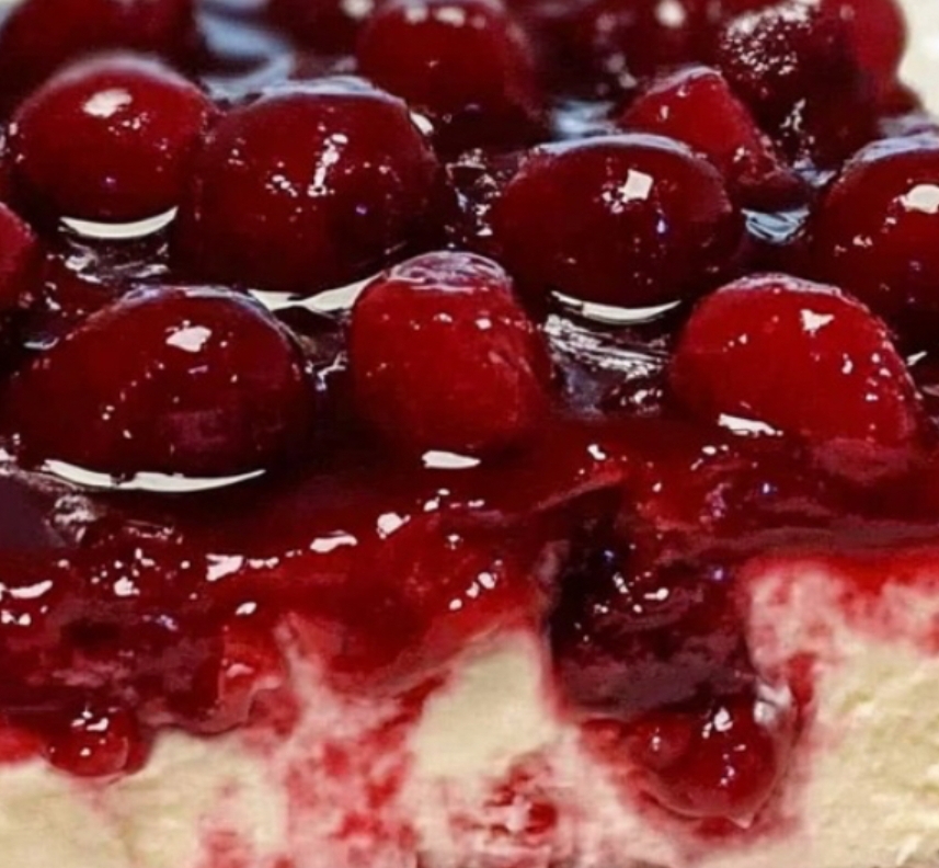 Ingredients:For the crust:1 ¼ cups graham cracker crumbs¼ cup unsalted butter, melted¼ cup white sugarFor the filling:1 (8-ounce) package cream cheese, softened1 cup powdered sugar1 teaspoon vanilla extract1 cup heavy whipping cream1 (12.5-ounce) can cherry pie filling (or filling of your choice)Instructions:Prepare the Crust:In a medium bowl, combine graham cracker crumbs, melted butter, and sugar until the mixture resembles wet sand.Press the mixture firmly into the bottom and slightly up the sides of a 9-inch pie plate to form the crust.Make the Filling:In a large bowl, use an electric mixer to beat the softened cream cheese, powdered sugar, and vanilla extract until smooth and creamy.In a separate chilled bowl, whip the heavy cream until soft peaks form.Gently fold the whipped cream into the cream cheese mixture until well combined and smooth.Assemble the Cheesecake:Spoon the filling into the prepared crust, spreading it evenly.Refrigerate the cheesecake for 2 to 3 hours, or until set.Add the Topping:Once the cheesecake is firm, spread the cherry pie filling over the top.Serve immediately or refrigerate until ready to enjoy.Tips:For a homemade touch, consider preparing your own cherry topping using fresh or frozen cherries cooked down with a bit of sugar and cornstarch until thickened.Feel free to experiment with different pie fillings, such as blueberry or strawberry, to suit your taste preferences.Ensure the cream cheese is fully softened before mixing to achieve a smooth filling without lumps.This no-bake cherry cheesecake is a testament to the fact that delightful desserts don’t always require extensive preparation. With its rich filling, buttery crust, and sweet cherry topping, it’s sure to become a favorite in your dessert repertoire.