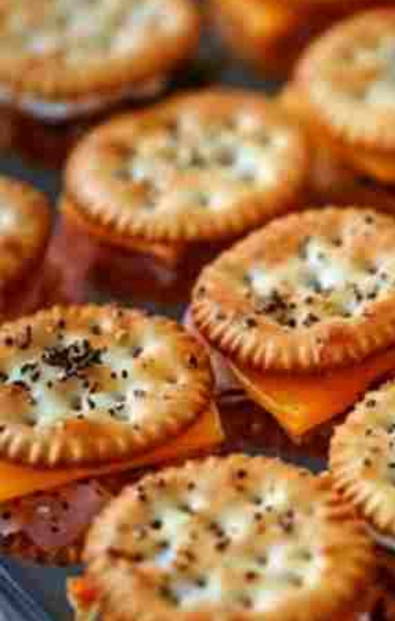 Set up the sandwiches: Onto the baking sheet, scatter half of the Ritz crackers. Put the remaining crackers on top after the ham and cheese.