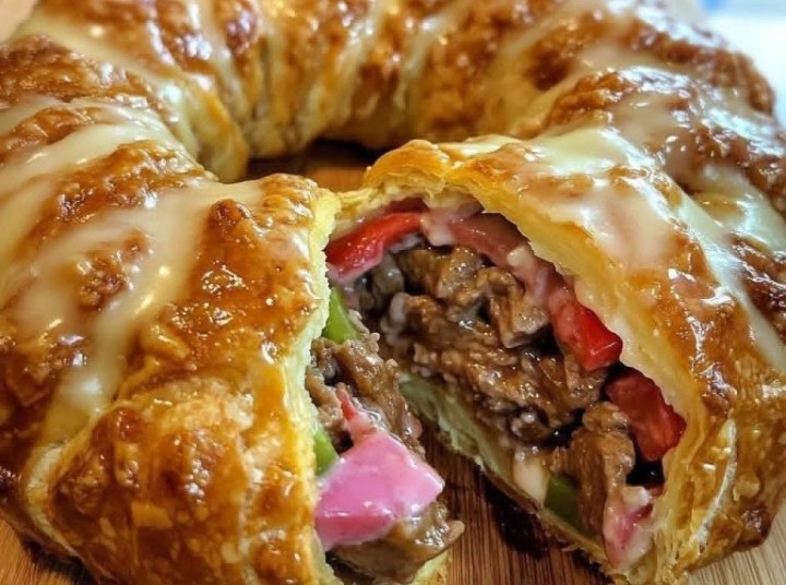 A crowd-pleasing twist on the classic Philly cheese steak — this crescent ring wraps savory steak, caramelized peppers and onions, and melty provolone inside golden, flaky crescent roll dough. It’s the ultimate game day appetizer, party centerpiece, or weeknight comfort food that’s as fun to make as it is to eat!