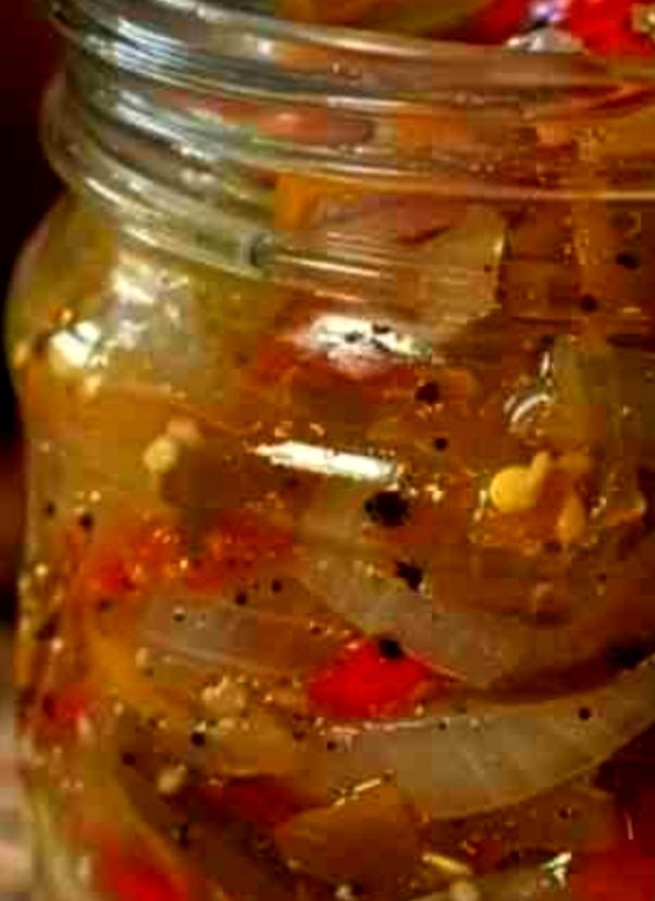 Pour the hot vinegar mixture over the sliced peppers and onions. Stir well to combine.
