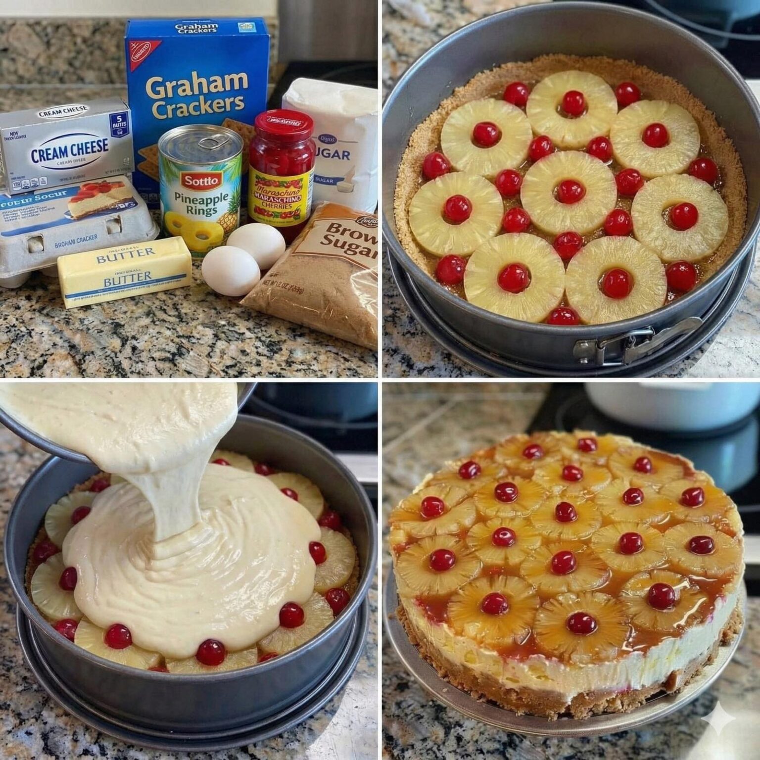 1. Pour the filling: Carefully pour the cheesecake batter over the prepared pineapple and crust. Use a spatula to smooth out the top.