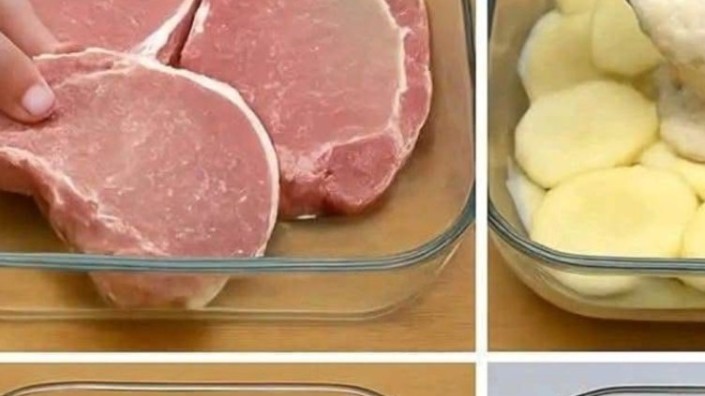 Place sliced potatoes or baby potatoes in the dish under the chops.