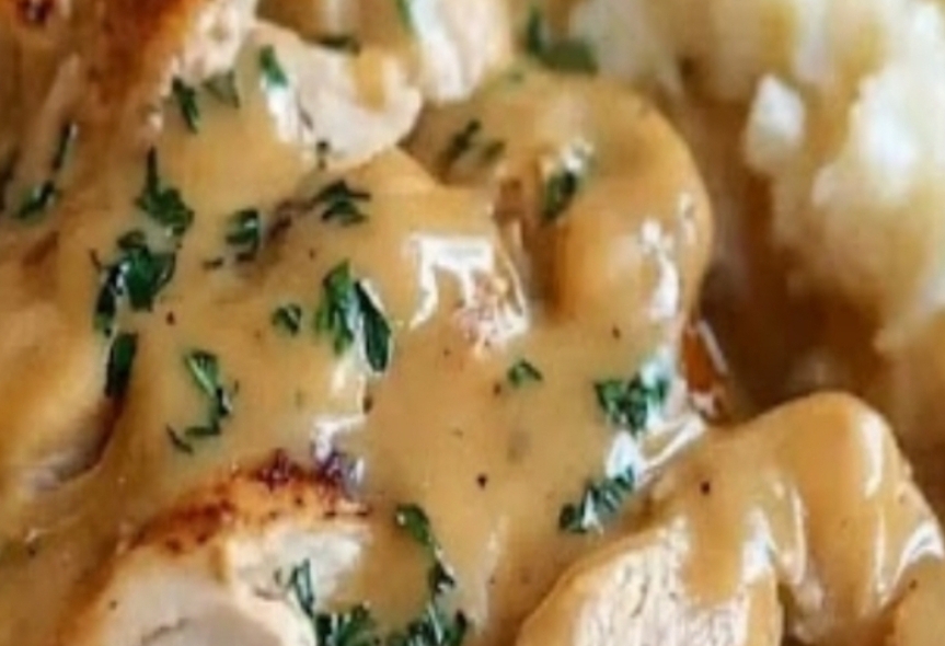 “Tender chicken cooked in a rich, creamy gravy—perfect for a comforting dinner with minimal effort. Pair with mashed potatoes, rice, or biscuits for the ultimate meal!”Ingredients2 lbs boneless, skinless chicken breasts or thighs1 (10.5 oz) can cream of chicken soup1 (10.5 oz) can cream of mushroom soup (optional, or use two cans of cream of chicken for a milder flavor)1 packet dry ranch seasoning mix1 packet chicken gravy mix1 cup chicken broth1/2 teaspoon garlic powder1/2 teaspoon onion powderSalt and black pepper, to taste1/2 cup sour cream (optional, for extra creaminess)Fresh parsley, chopped (for garnish)InstructionsStep 1: Prepare the ChickenPlace the chicken breasts or thighs in the bottom of your slow cooker.Step 2: Make the Gravy MixtureIn a bowl, combine the cream of chicken soup, cream of mushroom soup (if using), ranch seasoning mix, chicken gravy mix, chicken broth, garlic powder, and onion powder.Whisk until smooth and pour the mixture over the chicken.Step 3: Cook the ChickenCover the slow cooker and cook on low for 6–8 hours or high for 3–4 hours, until the chicken is tender and easily shredded.Step 4: Add the CreaminessOnce the chicken is cooked, remove it from the slow cooker and shred or leave whole, as desired.Stir the sour cream into the gravy for extra richness, then return the chicken to the slow cooker. Let it warm through for another 10–15 minutes.Step 5: ServeServe the creamy chicken and gravy over mashed potatoes, rice, egg noodles, or with biscuits.Garnish with freshly chopped parsley for a touch of freshness.Why You’ll Love This RecipeEffortless Comfort Food: Just set it and forget it!Rich and Creamy: The combination of ranch seasoning and gravy mix creates an irresistible flavor.Versatile: Works with your favorite sides for a complete meal.Pro TipsAdd Veggies: Add sliced mushrooms, diced carrots, or frozen peas for a complete one-pot meal.Make It Lighter: Use low-sodium soups and broth or swap sour cream for Greek yogurt.Leftovers: Store leftovers in an airtight container in the fridge for up to 3 days or freeze for later.This Slow Cooker Creamy Chicken & Gravy recipe is a hit with the whole family. It’s cozy, satisfying, and perfect for busy days when you want a home-cooked meal without the fuss.Enjoy!