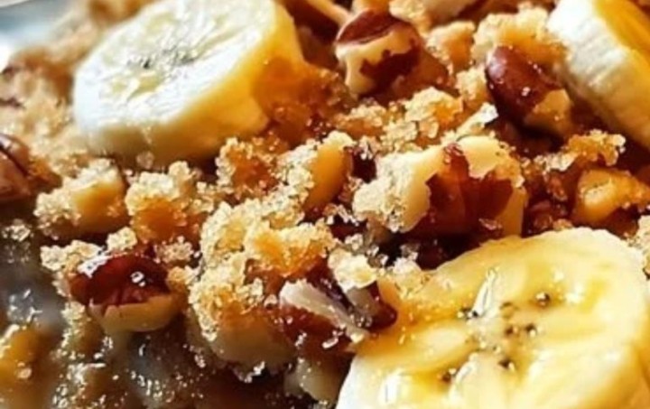 A warm, buttery Southern classic — rich with caramelized bananas, sweet oat topping, and a hint of crunch from pecans. Perfect for any cozy dessert table.