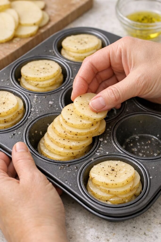 Repeat the layers—potato slices, then cheese—until the muffin cups are filled almost to the top. Press the stacks down gently with your fingers as you go to keep them neat and compact.