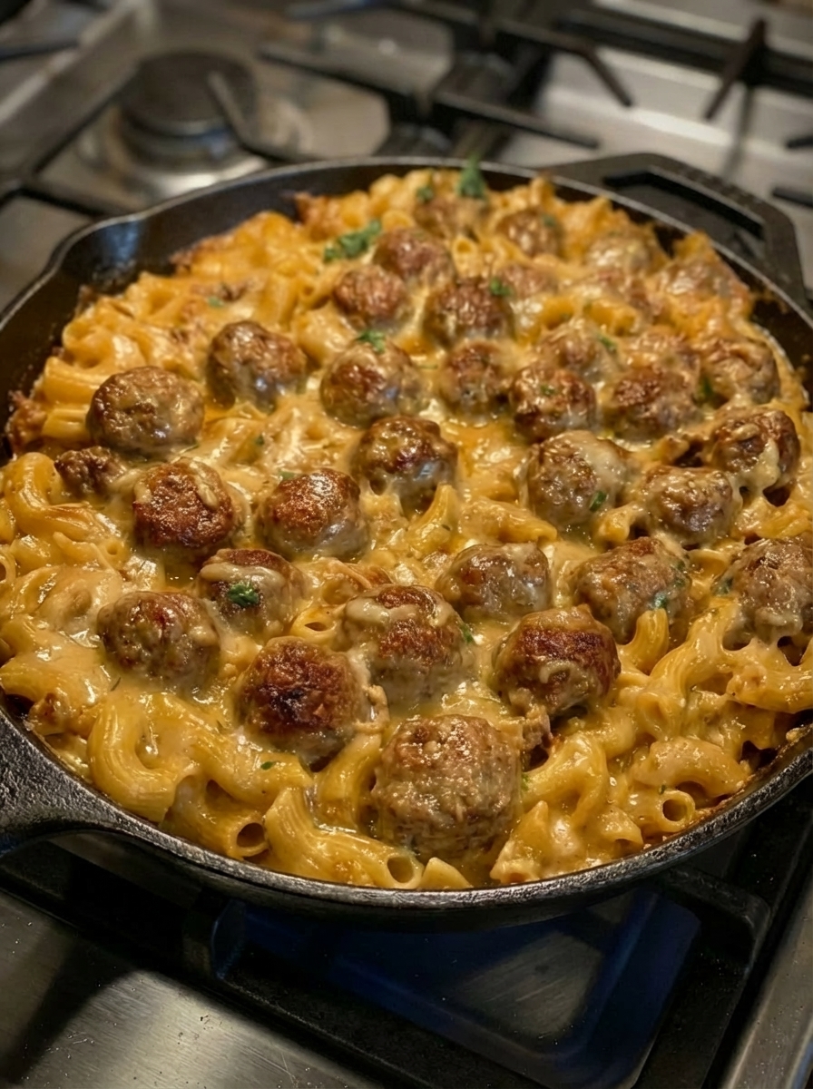 Step 6: Into the prepared baking dish, add the pasta and top with meatballs. Over the pasta and meatballs, evenly pour the sauce and sprinkle with cheese.