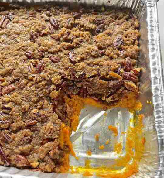 Mix sugar, flour, pecans, and melted butter in a small bowl until it becomes crumbly. Put on top of the sweet potatoes.