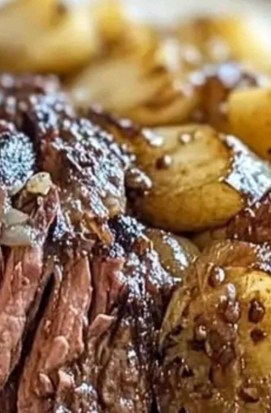 A comforting, melt-in-your-mouth pot roast with caramelized vegetables in a rich, savory gravy.