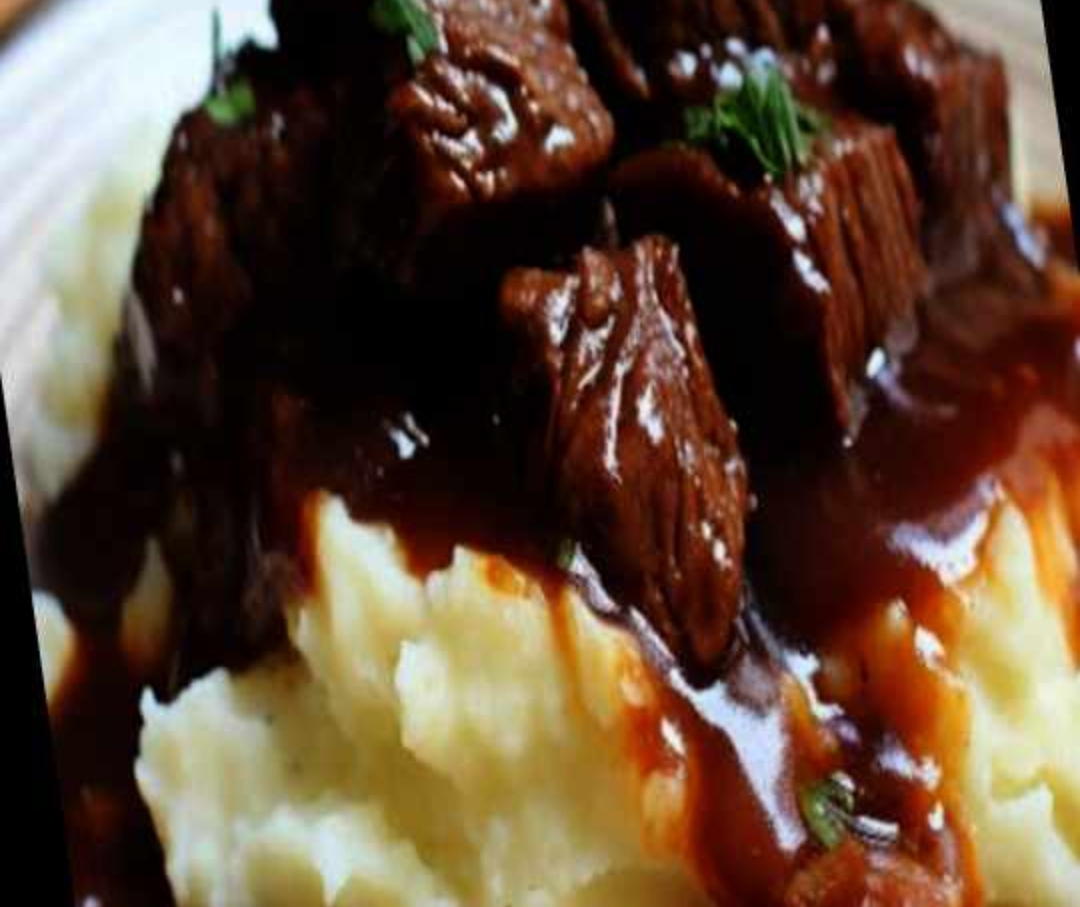 Place the beef tips in a casserole dish, then pour the mixture over the beef, ensuring the pieces are well-covered.