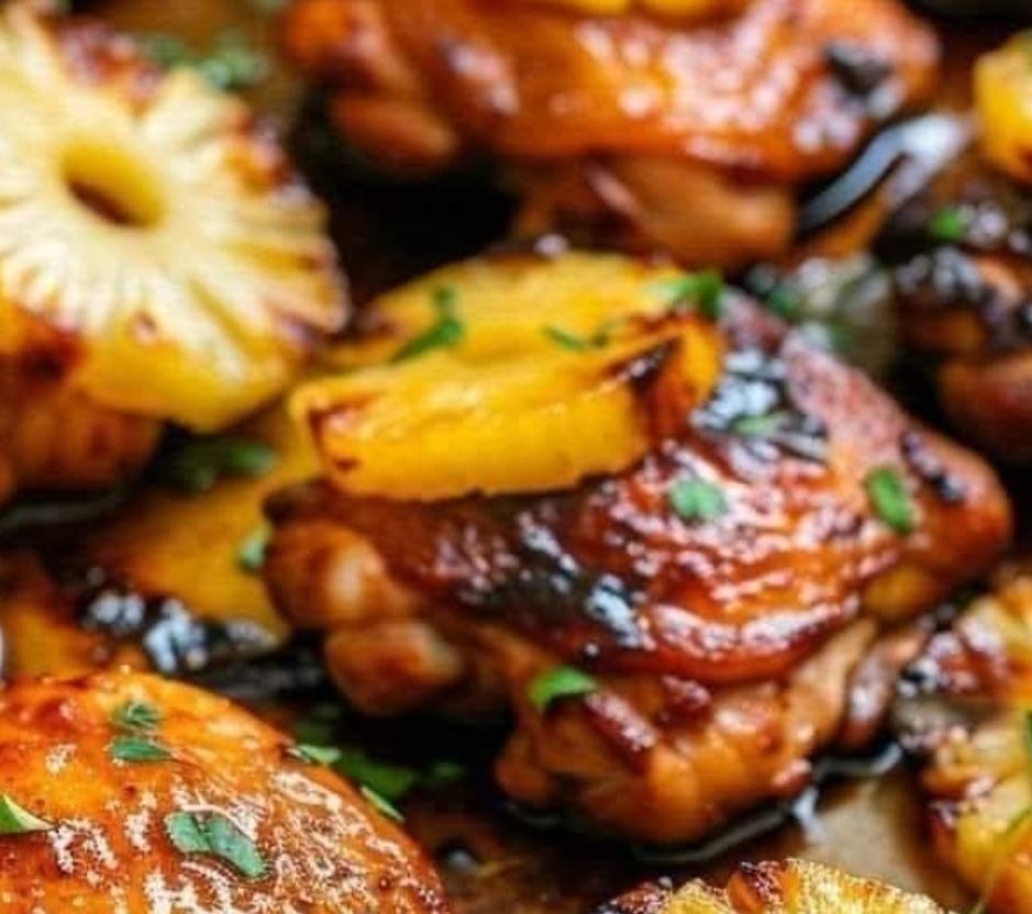 Ingredients:3 pounds of chicken thighs, bone-in, skin-on1 cup pineapple juice1/2 cup soy sauce1/2 cup brown sugar, packed1/3 cup ketchup1/4 cup chicken broth2 tablespoons fresh ginger, grated2 garlic cloves, minced2 teaspoons sesame oil1 tablespoon cornstarch1 tablespoon waterOptional garnishes: fresh pineapple slices, sliced green onions, sesame seedsInstructions:Preheat your oven to 375°F (190°C) and arrange the chicken thighs in a baking dish.In a saucepan, mix pineapple juice, soy sauce, brown sugar, ketchup, chicken broth, ginger, garlic, and sesame oil. Heat until it reaches a low boil.Simmer for 10 minutes until the sauce thickens slightly.Create a slurry with cornstarch and water and stir it into the sauce until it thickens.Pour the sauce over the chicken, ensuring it’s well coated.Bake for 45 minutes to an hour, or until the chicken reaches an internal temperature of 165°F (74°C) and the sauce caramelizes. Baste halfway through for added flavor.Let it rest before serving, garnished with pineapple slices, green onions, and sesame seeds.Variations & Tips:For a lighter option, use boneless, skinless chicken breasts or thighs and adjust cooking time.Marinate the chicken in the sauce beforehand for deeper flavor.Add Sriracha or red pepper flakes for a spicy kick.Substitute pineapple juice with mango nectar for a different tropical twist.For a smoky finish, grill the chicken briefly.This versatile sauce works great on ribs or as a glaze for grilled veggies.Discover the joy of Hawaiian cooking with this easy-to-follow Baked Huli Huli Chicken recipe, a delightful mix of traditional taste and modern convenience.Enjoy!