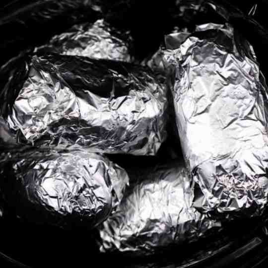 Tightly wrap each potato in aluminum foil and place them in the slow cooker.